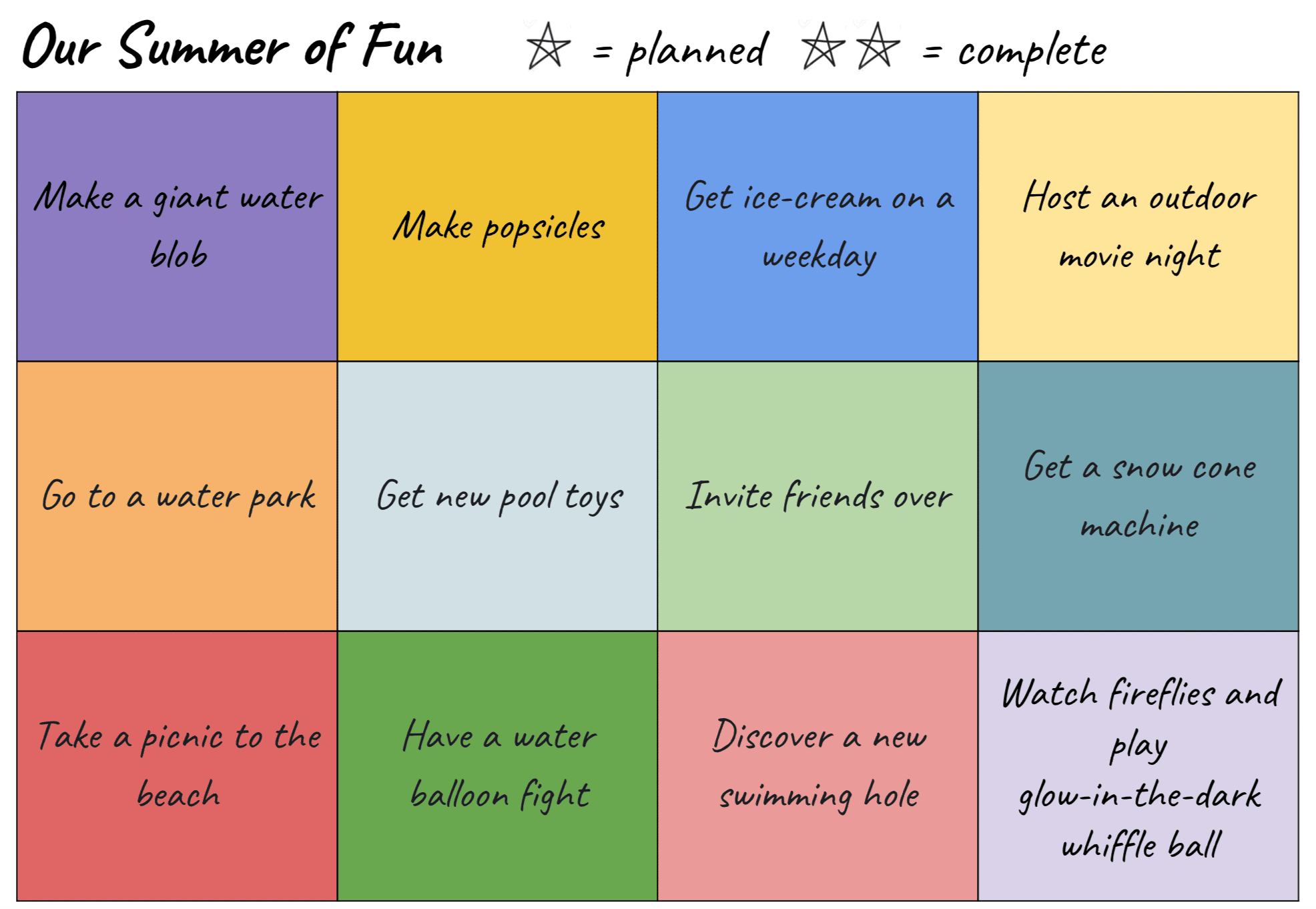 We can do two activities per week. I will post this tracker on our refrigerator. Each boy will place a star next to one activity each week. They will both get to do the activity that the other brother picks. Then we will star the activity again when it’s complete. Voila! Instant summer fun without too much stress/hassle. You can download it for free here. It includes directions about how to modify it to meet your own needs.